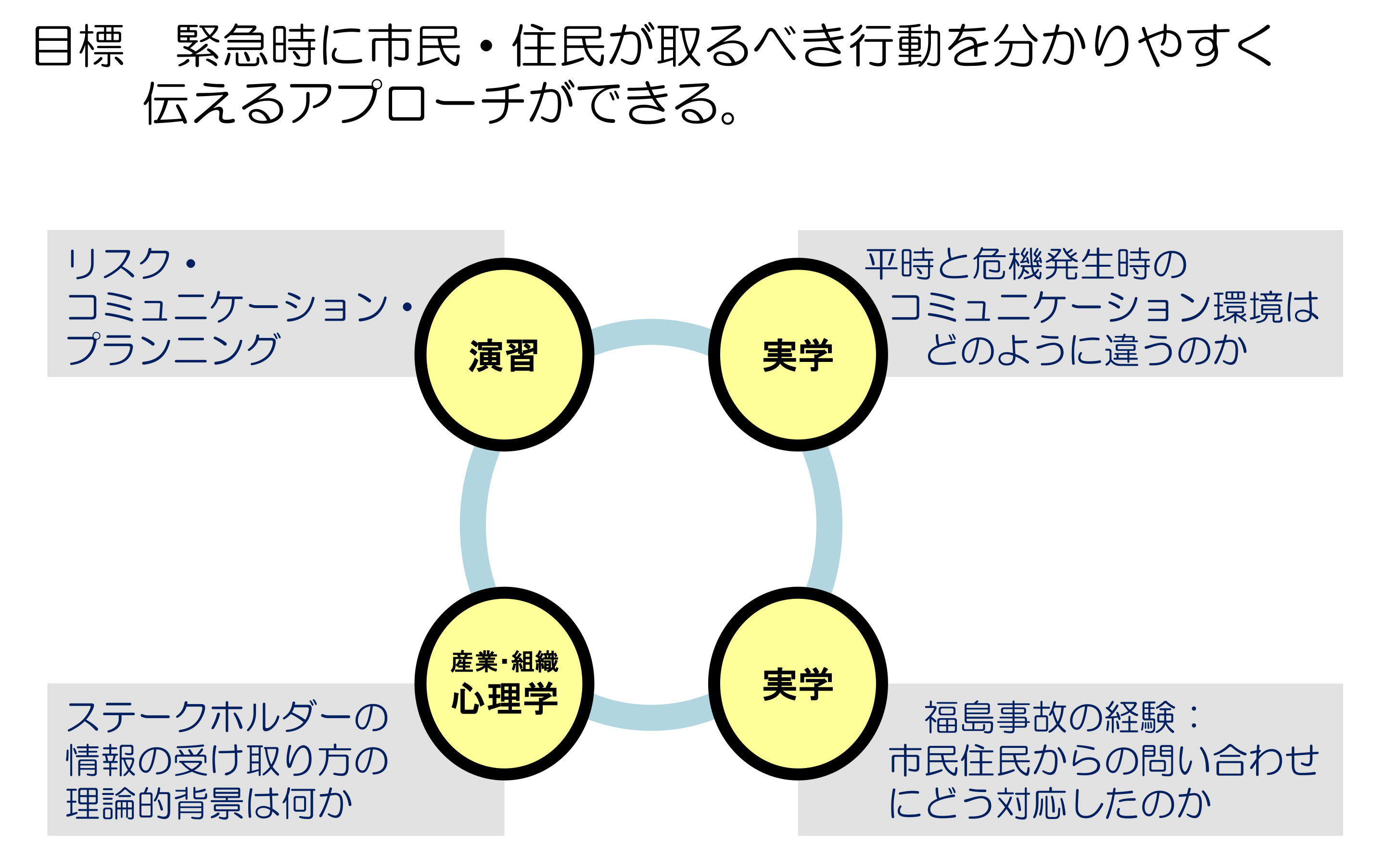 産業・組織心理学、危機管理対応、福島事故経験、演習などの実学を通じて「緊急時に市民・住民が取るべき行動を分かりやすく伝えるアプローチができる」ことを目標にしました。